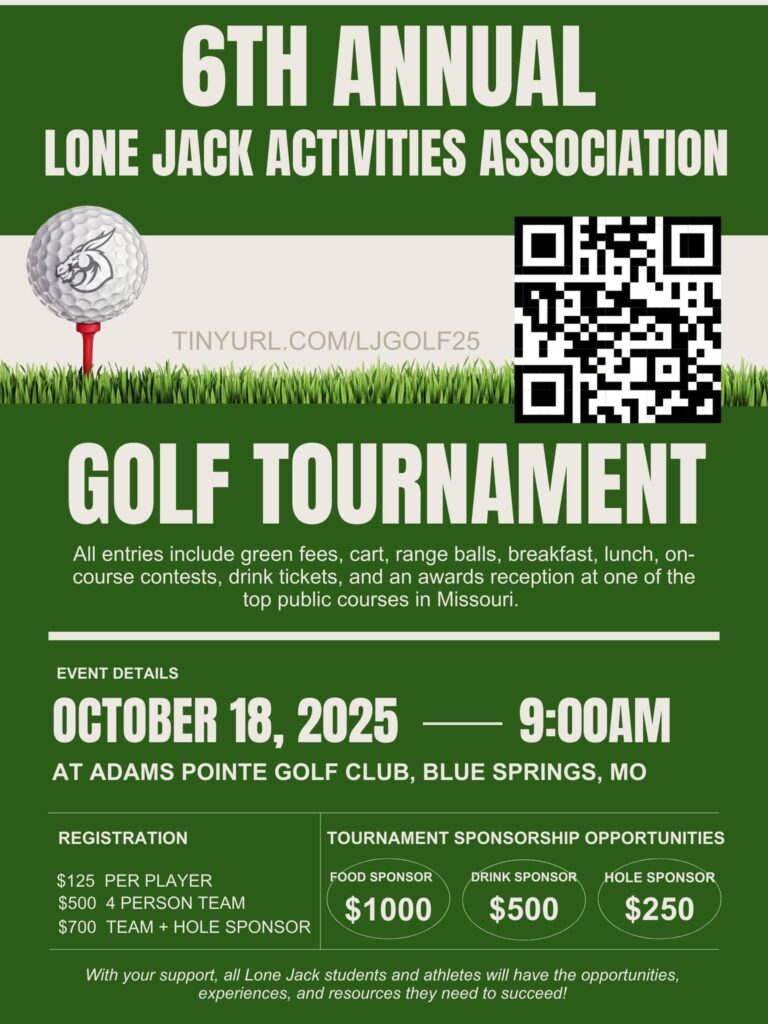 Scan the QR code or visit tinyurl.com/ljgolf25 for more details and to register! Your support helps provide Lone Jack students and athletes with the opportunities and resources they need to succeed!!